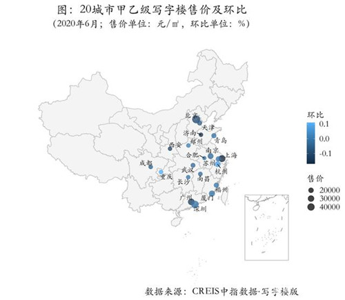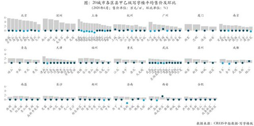 6月,20城市甲乙級寫字樓平均售價為21507元/㎡,同環(huán)比分別為3.49%和-0.03%。