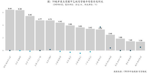 同比:6月,20個城市甲乙級寫字樓售價同比上漲。其中,成都同比上漲5.94%,重慶、長沙漲幅均超過4%,上海漲幅最低,為1.69%。
