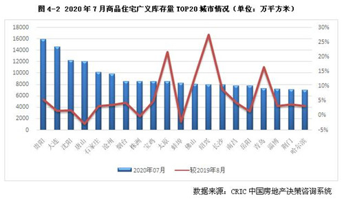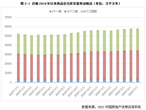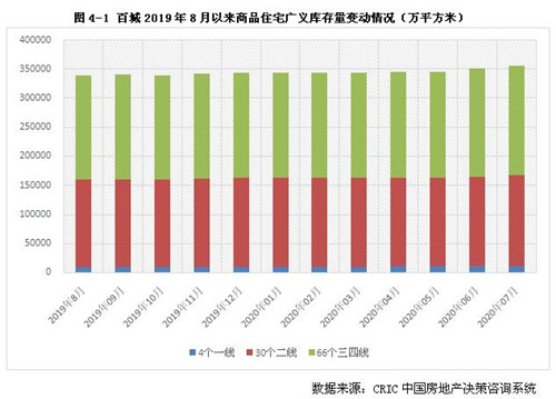 而從廣義庫存的角度來看,自2019年8月以來,百城庫存量就一直保持緩步上行趨勢,至7月末,庫存量達(dá)到了356947萬平方米,環(huán)比小幅微增1%,較2019年8月增長5%。
