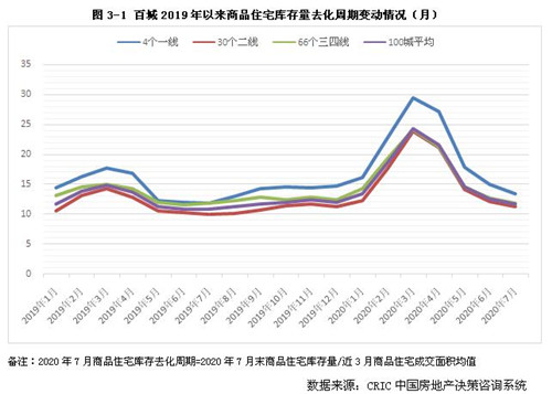 從商品住宅去化周期來看,隨著國內(nèi)新冠疫情得到初步控制,樓市供求日漸恢復(fù),整體去化周期也呈現(xiàn)出逐月下行態(tài)勢,7月已降至12個月,基本恢復(fù)到疫前水平。分能級來看,一線城市7月商品住宅去化周期達(dá)到了13個月,略高于百城平均,二三線基本維持在11-12個月,庫存風(fēng)險相對可控。而從變化情況來看,本月一線去化周期下降最為顯著,環(huán)比降幅在不同能級城市中居首,達(dá)到了11%,同比增幅為13%,顯著高于去年同期水平。