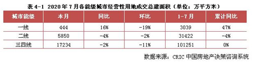 其中,一線增長最為顯著,較2019年8月已增長18%,整體庫存壓力依舊較大。究其原因,主要與疫情之后政府加緊供地導(dǎo)致土地成交量激增密切相關(guān)。據(jù)CRIC監(jiān)測,2020年1-7月一線城市經(jīng)營性用地成交總建面積達(dá)到了3039萬平方米,同比上漲了47%,在不同能級城市中漲幅居首,這也直接導(dǎo)致了一線未開工地塊建面穩(wěn)步增加,預(yù)判下月,一線的廣義庫存量仍有望高位維持。