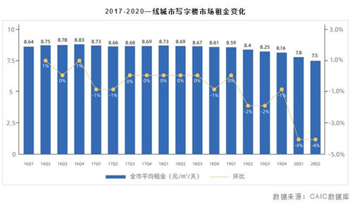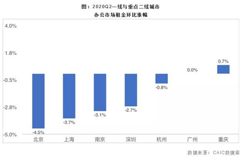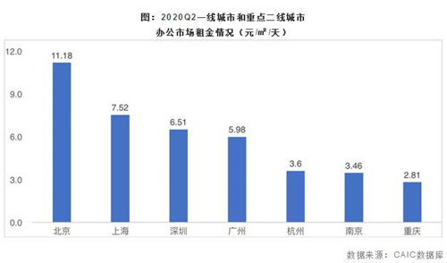 CAIC重點(diǎn)監(jiān)測城市的辦公市場數(shù)據(jù)顯示,2020年前兩個(gè)季度,重點(diǎn)城市辦公市場平均租金連續(xù)普遍下行,繼2018年四季度至今,重點(diǎn)城市平均租金已連續(xù)8個(gè)季度呈現(xiàn)下滑趨勢。北京租金環(huán)比降幅最大為4.5%,但仍以11.2元/㎡/天的價(jià)格繼續(xù)領(lǐng)跑全國辦公市場,上海和杭州“以價(jià)換量”效果最為明顯,出租率迎來小幅回升。