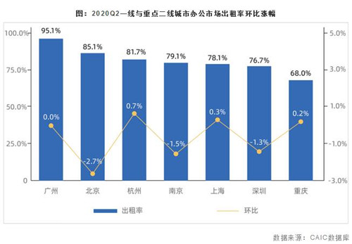 在整體租金持續(xù)回調(diào)的背景下,重點(diǎn)監(jiān)測的7城中,廣州、重慶、上海和杭州的出租率企穩(wěn)回升,雖然環(huán)比漲幅均在1%以下,但可以視為其辦公市場在經(jīng)歷了一季度疫情沖擊后逐步復(fù)蘇的信號。