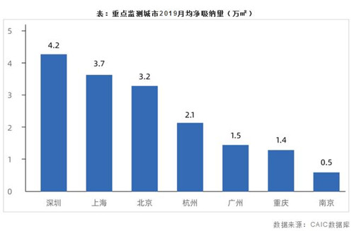 上海和北京分別以3.7萬平方米和3.2萬平方米緊隨其后。而南京2019年的辦公租賃市場需求催生較弱,月均凈吸納量僅為0.5萬平方米。