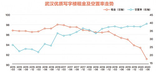 截至2020年6月,武漢優(yōu)質(zhì)寫字樓總存量為526萬平方米,寫字樓平均入住率為62.7%,平均租金約90.8元/㎡/月,租金同比下滑4.5%;其中甲級寫字樓存量191萬平方米,平均入住率65.7%,平均租金108.8元/㎡/月,租金環(huán)比一季度下跌5.1%。