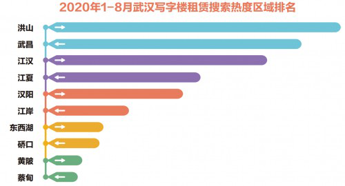 9月15日,58同城、安居客發(fā)布《后疫情時代的武漢寫字樓市場報告》,數(shù)據(jù)顯示,截至8月搜索熱度已恢復至去年同期8成水平,洪山區(qū)為1-8月搜索熱度Top 1,新興商務區(qū)光谷迅速崛起,帶動寫字樓去化。