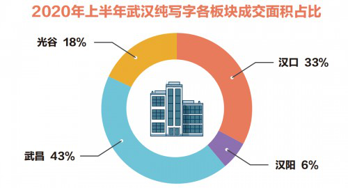 58同城、安居客《后疫情時代的武漢寫字樓市場報告》指出,2020年上半年武漢市一手商辦物業(yè)的總體去化量約為20萬平方米,同比去年下滑49%;其中純寫字樓去化約6萬平方米,占商辦去化總量的31%,占比與去年同期相當。