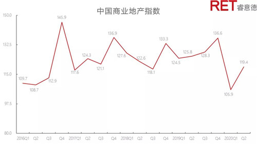 2020年第二季度,中國商業(yè)地產指數(shù)環(huán)比顯著增長,同比回落幅度收窄。伴隨著總體經濟穩(wěn)步復蘇,實體商業(yè)也迎來消費回暖趨勢。