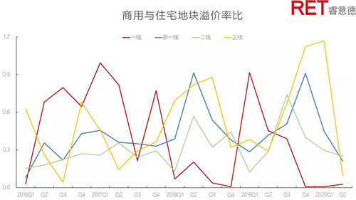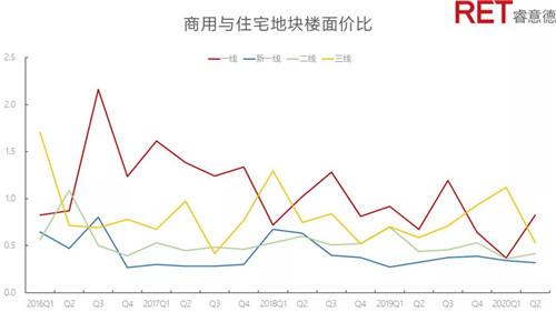 2020年第二季度,中國商用土地指數(shù)為82.4,環(huán)比上升19.4%,同比下降16.7%。一線城市商用土地交易情況較上一季度基本持平,受二三線城市商用土地交易情況影響,整體市場流拍問題好轉,流拍數(shù)量環(huán)比下降7.3%,成交流拍比為37.0。全國商辦用地成交數(shù)量較上一季度明顯增長,商業(yè)用地占總土地交易量比例較第一季度沒有顯著變化。其中,三線城市商用土地市場成交流拍比由上一季度的65.0降至23.9。