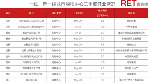 一線城市僅深圳有購物中心新項目開業(yè)。5月30日,福田星河COCO Park二期正式亮相,與一期僅隔一條馬路,位于星河國際首層,由原君尚百貨改造而來。項目打造了福田區(qū)最大的兒童體驗地“星趣小鎮(zhèn)”以及200平方米的無際空間藝術展覽館,入駐品牌有首進華南的安莉芳新零售體驗店、麥當勞未來智慧概念餐廳、sp@ce天虹超市、Twinkle耀童親子餐廳等。華僑城與招商蛇口聯(lián)合打造的紅山六九七九商業(yè)中心于6月底開業(yè),集公園式商業(yè)街區(qū)、體驗式公寓、時尚演藝劇場、人文藝術展覽館及城市精品酒店于一體,總建筑面積約34萬平方米,商業(yè)部分體量約10萬平方米,有華南首家自主運營開心麻花劇院、盒馬鮮生、CGV影院主力店等。