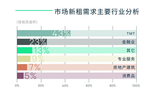 TMT頭部企業(yè)經(jīng)營賽道多元化為市場不斷注入新動能,使得行業(yè)新租需求占比高達43%,并完成多起大面積租賃交易。金融占23%緊隨其后,其中基金,保險,證券為主力。專業(yè)服務(wù)業(yè)的律所擴租和搬遷依然活躍,且需求主要集中在CBD。此外,第三方辦公運營商抓住市場契機擴張。