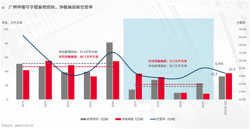 圖1:廣州甲級寫字樓新增供應、凈吸納量和空置率