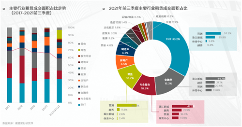 近期隨著圍繞教育的相關政策陸續(xù)發(fā)布,線上教育與游戲類企業(yè)對于擴張與置換物業(yè)表現(xiàn)謹慎。一些業(yè)主為了減少樓宇的空置時間,主動讓價以提升項目入駐率。專業(yè)服務、金融業(yè)、TMT仍然是需求主力。其中專業(yè)服務業(yè)成交占比居首,較上季度擴大5.5個百分點。以律所、保險為代表的細分行業(yè)租戶選擇搬遷至面積更大或品質更高的辦公空間,如盈科律師事務所租下周大福金融中心近4000平方米辦公室。另一方面,盡管TMT在三季度的成交占比有所下降,但擴張的需求仍然更多的來自于成長中的互聯(lián)網與科技類企業(yè)。例如快手租下廣電平云廣場5000平方米辦公室用于擴租。