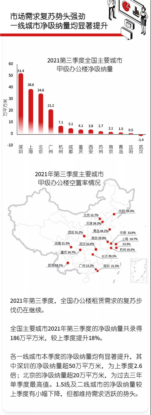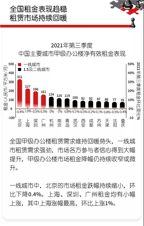 近日,仲量聯(lián)行發(fā)布2021年第三季度全國(guó)辦公樓市場(chǎng)概覽指出,三季度,全國(guó)寫字樓整體市場(chǎng)需求復(fù)蘇加速,全國(guó)租金表現(xiàn)趨穩(wěn),“雙減”政策對(duì)一線城市甲級(jí)辦公樓影響有限。
