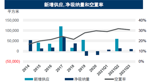 第三季度,大連市零售市場無新增供應(yīng)入市,總存量依舊維持在188.8萬平方米,且該存量或?qū)⒕S持至2022年。