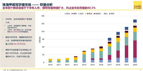 2020年,全市四個甲級寫字樓項目皆于下半年交付,共計為市場帶來28.4萬平方米寫字樓面積,珠海甲級寫字樓物業(yè)市場總存量也因此上升至166.3萬平方米。