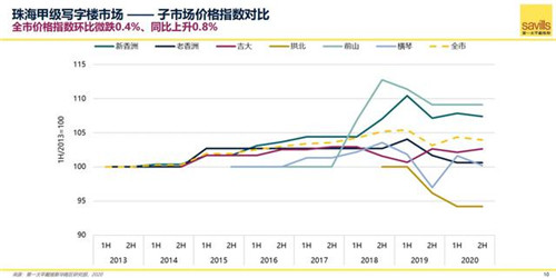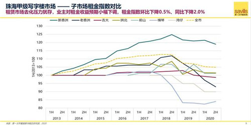 因市場既有供過于求態(tài)勢延續(xù),疊加整體租賃需求備受疫情沖擊,與此前數(shù)年相較,本年業(yè)主對項目租金預期隨之普遍下調。截至年末,珠海甲級寫字樓物業(yè)市場平均租金下跌至人民幣每平方米每月93.1元,租金指數(shù)同比下跌2.0%。
