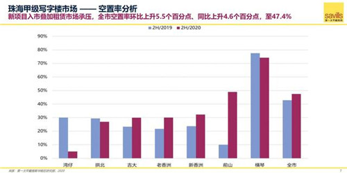 本年,因早期疫情負面沖擊過于顯著,項目退租面積普遍未能于下半年完全彌補,全市空置率同比上升4.8個百分點,至21.5%,為歷史最高水平。
