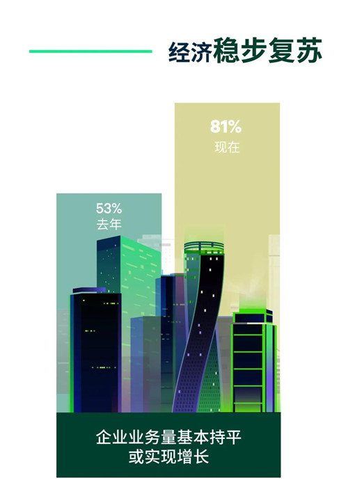 盡管各城市出現(xiàn)零星暴發(fā)的病例,但商務(wù)活動整體表現(xiàn)穩(wěn)定并保有增長勢頭。81%的受訪企業(yè)表示公司業(yè)務(wù)量相較疫情前水平已基本持平或?qū)崿F(xiàn)增長,該占比較2020年5月的租戶調(diào)查結(jié)果增長28個百分點。
