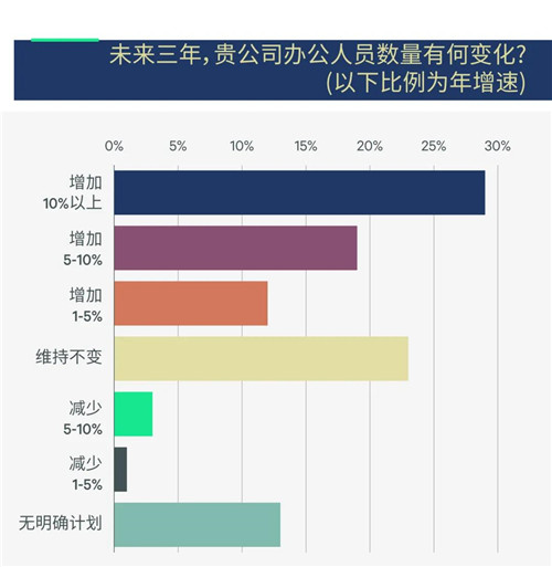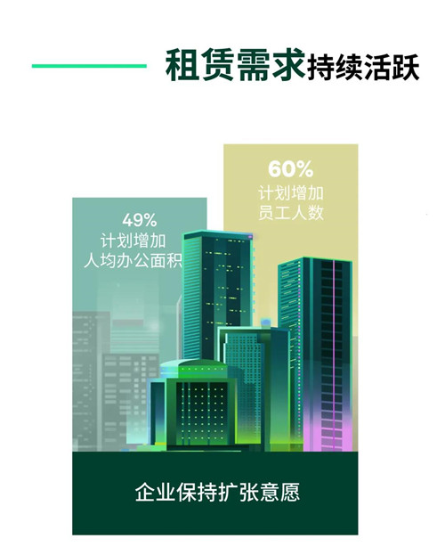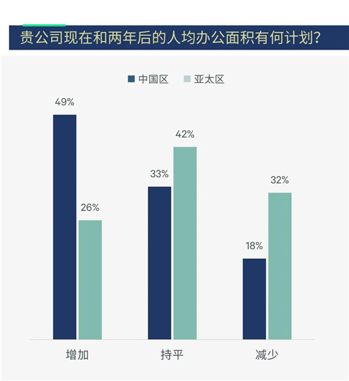 另一方面,疫情后,租戶考慮降低辦公室密度。不斷增長空間需求也來源于疫情后企業(yè)對降低辦公室密度的考量。租戶調(diào)查顯示,49%的受訪企業(yè)計劃未來兩年增加人均辦公面積,遠(yuǎn)高于亞太區(qū)的平均水平。