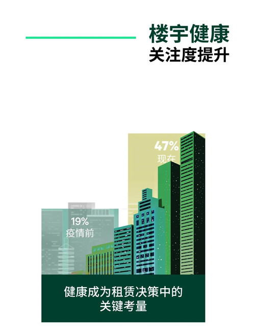 疫情爆發(fā)后,健康成為企業(yè)租賃策略中重要的考量因素之一。租戶調(diào)查結(jié)果顯示,47%的受訪企業(yè)認(rèn)為樓宇健康是影響其選址決策的重要因素,該比例較疫情前提升了28個百分點。