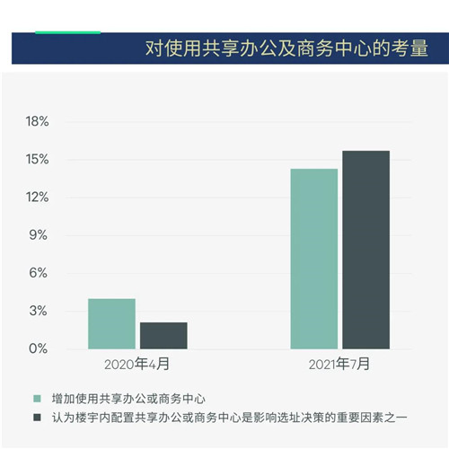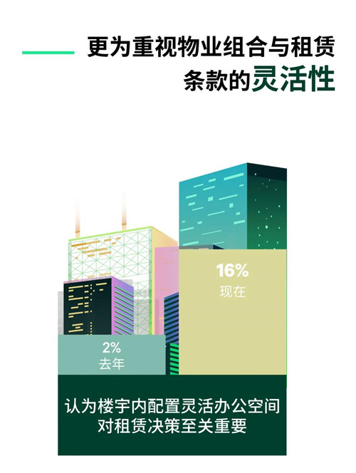 因此,租戶也期望以更靈活的資產(chǎn)配置方式支撐其靈活辦公模式。14%的受訪企業(yè)計劃未來增加共享辦公或商務(wù)中心的使用,另有16%的受訪企業(yè)認(rèn)為樓宇內(nèi)共享辦公或商務(wù)中心的配置是影響選址決策的重要因素。這兩項占比較一年前均有明顯提升。