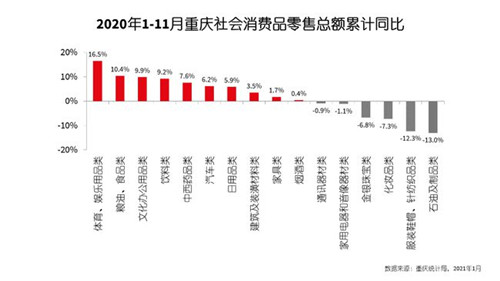 2020年1-11月,重慶社零總額達(dá)到10,597.26億元,名義增長(zhǎng)0.4%。疫情令消費(fèi)者支出結(jié)構(gòu)產(chǎn)生變化,健康生活方式的受重視程度逐年提升,帶動(dòng)體育、娛樂(lè)用品類商品消費(fèi)大幅增長(zhǎng),以16.5%的增幅領(lǐng)漲各大品類。新能源汽車消費(fèi)在政策利好以及限行規(guī)定下不斷提升,限額以上單位汽車類商品零售額同比增長(zhǎng)6.2%,遠(yuǎn)超全國(guó)平均水平。2019-2021年重慶住宅市場(chǎng)進(jìn)入集中交付期,帶動(dòng)家具類商品消費(fèi)增長(zhǎng)。由于購(gòu)房、購(gòu)車等消費(fèi)對(duì)非基礎(chǔ)消費(fèi)造成擠出,導(dǎo)致金銀珠寶、服飾、化妝品類消費(fèi)出現(xiàn)下滑。仲量聯(lián)行數(shù)據(jù)顯示,全市優(yōu)質(zhì)零售物業(yè)空置率較去年同期上升1.2個(gè)百分點(diǎn),報(bào)13.3%。盡管疫情后市場(chǎng)需求逐漸恢復(fù),但相比其他新一線城市,空置率水平仍處高位,加之年底大量新增供應(yīng)入市,市場(chǎng)競(jìng)爭(zhēng)更加激烈,部分經(jīng)營(yíng)狀況不理想的購(gòu)物中心仍在降租,因此全市購(gòu)物中心首層平均租金報(bào)365.6元/平方米/月,同比下降3.0%。