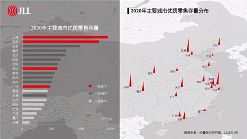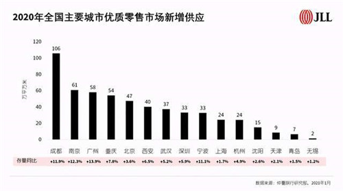 仲量聯(lián)行數(shù)據(jù)顯示,2020年中國(guó)大陸20個(gè)主要一二線城市優(yōu)質(zhì)零售物業(yè)市場(chǎng)新增供應(yīng)接近600萬(wàn)平方米,同比回落1/4左右,總存量增長(zhǎng)至1.16億平方米。全年,成都以106萬(wàn)平方米的新增供應(yīng)引領(lǐng)全國(guó),南京、廣州、重慶三個(gè)城市增量超過(guò)50萬(wàn)平方米,分列二至四位。