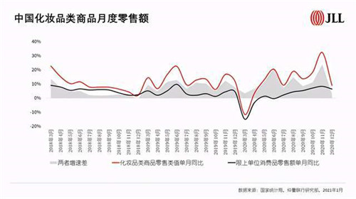 化妝品之于女性消費(fèi)屬于“基本品消費(fèi)”,尤其是年輕一代在美妝、護(hù)膚方面的觀念十分前衛(wèi),亦不局限于國(guó)際一線大牌,國(guó)貨商品的高性價(jià)比和品質(zhì)提升,足以吸引年輕消費(fèi)者。作為零售物業(yè)快速擴(kuò)張三大業(yè)態(tài)之一,化妝品牌坪效高、客流效應(yīng)明顯,備受購(gòu)物中心青睞,已成為其首層業(yè)態(tài)調(diào)整的主流租戶。疫情后,化妝品類的銷售額增速與市場(chǎng)均值的差距進(jìn)一步拉大,顯示出這一細(xì)分市場(chǎng)的巨大潛力。