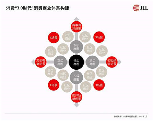仲量聯(lián)行在2020年已提出“中國(guó)邁入消費(fèi)3.0時(shí)代”的研究視角,具體請(qǐng)參見(jiàn)《“消費(fèi)內(nèi)循環(huán)”模型與“消費(fèi)3.0”》一文。在消費(fèi)3.0時(shí)代,新的消費(fèi)內(nèi)容創(chuàng)造更具多元性的消費(fèi)場(chǎng)景,而新的消費(fèi)場(chǎng)景反過(guò)來(lái)在補(bǔ)充完善傳統(tǒng)購(gòu)物中心消費(fèi)場(chǎng)景的同時(shí),讓多元化物業(yè)載體煥新升級(jí),承載更多現(xiàn)代化消費(fèi)場(chǎng)景,比如文創(chuàng)電競(jìng)、賽事演繹、市井后街、公園綠道等等以及更多尚待發(fā)掘、尚且未知的“X場(chǎng)景”。