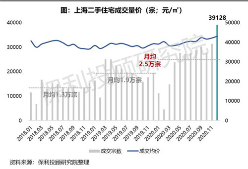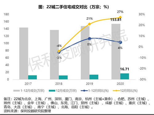 據(jù)保利投顧研究院監(jiān)測,2020年重點城市二手住宅累計成交153.81萬宗,同比增長4%,達近四年高位。12月成交16.71萬宗,同比上升27%,下半年以來每月成交量均較去年同期增長20%以上,高速修復態(tài)勢帶動整體成交量呈深V反轉(zhuǎn)。