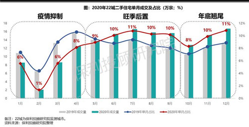 前期受疫情影響,重點城市成交低位,旺季不旺;5月以來抑制需求陸續(xù)釋放,22城月度成交基本保持超15萬宗的較高水平,整體旺季后移至年中且周期有所拉長;年底購房者資金相對充裕,部分婚房、學區(qū)房等需求在上漲行情下提前入市,帶動二手成交翹尾,12月成交占比進一步上漲至11%,單月成交量為全年最高位。