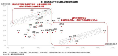 北上深等一線城市,市區(qū)可開發(fā)空間趨于飽和,宅地供應量少,新房稀缺,因此房地產(chǎn)成交趨向二手房市場;如南昌、長春、吉林等城市,市區(qū)出讓宅地量大,新房后續(xù)供應充足,客戶選擇較多,房地產(chǎn)市場整體以新房成交為主流,二手房成交占比不到三成,二手房市場發(fā)展成熟仍需時間。