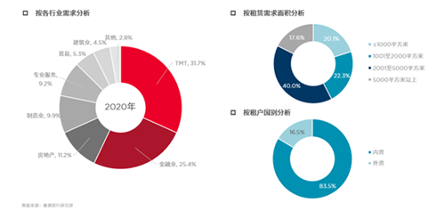 截至2020年第四季度,廣州甲級寫字樓市場空置率同比上升2.6個百分點至8.1%,為一線城市中最低。同時,廣州租金的跌幅也最小,僅同比下降5.4%至180.4元每月每平方米。年初受新冠疫情影響,企業(yè)租賃意愿減弱,退租和空置增加;下半年企業(yè)搬遷意愿逐步增強,業(yè)主普遍愿意提供更大的議價空間加速去化,多重因素刺激下市場活躍度有所上升。但是企業(yè)搬遷仍以成本控制為主要考慮。受疫情和整體經(jīng)濟環(huán)境影響,外資租戶活動有所放緩,年以內(nèi)資租戶主導市場需求。TMT和金融業(yè)為全年兩大主力需求來源,占比分別高達32%和25%。