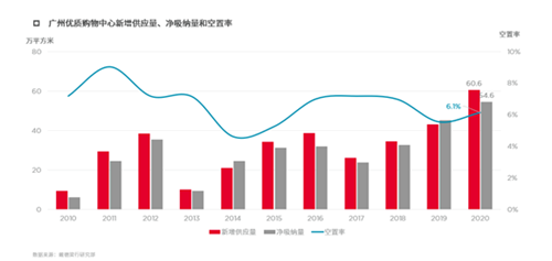 回顧2020全年,在度過前兩季度的低迷之后,隨著疫情的控制,廣州優(yōu)質(zhì)購物中心市場逐步回暖,展現(xiàn)強勁勢頭。在新增供應達十年高峰至60.6萬平方米的情況下,吸納量同時攀升至54.6,亦達十年之最。新項目良好的招商進展及年底前商家積極拓店擴張是實現(xiàn)吸納高峰的主因。截至第四季度,新增供應量小幅推動空置率上升0.6個百分點至6.1%,全市租金結(jié)構(gòu)性同比下降3.6%。