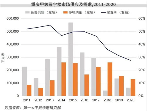 2020年,隨著重慶不斷改革發(fā)展,GDP突破2.5萬億大關(guān),第三產(chǎn)業(yè)占比逐年遞增;寫字樓空置率跌至27.5%,京滬創(chuàng)十年新高同時,新一線重慶創(chuàng)十年新低。此外,2020年成渝經(jīng)濟(jì)圈上升為國家戰(zhàn)略,帶動交通、產(chǎn)業(yè)建設(shè),對寫字樓市場的影響尤其深遠(yuǎn)。
