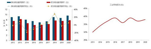 圖:2013-2020年全國(guó)300城工業(yè)用地推出、成交及成交占比情況