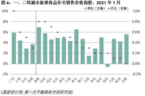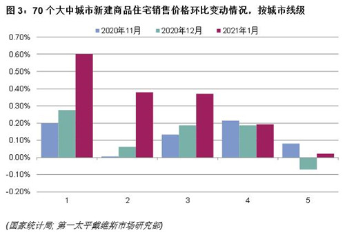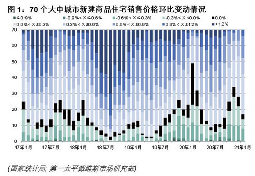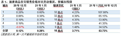 1月,全國70個(gè)大中城市新建商品住宅平均售價(jià)環(huán)比上漲0.28%,增速較去年12月的0.12%有所加快。平均售價(jià)較去年同期上漲3.71%,較指數(shù)設(shè)立基期(2010年12月)累計(jì)上漲53.73%。其中,53個(gè)城市的新建商品住宅售價(jià)錄得環(huán)比上漲,3個(gè)城市環(huán)比持平,14個(gè)城市環(huán)比下跌。
