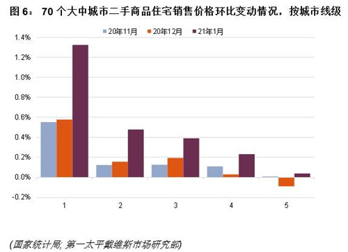 二手商品住宅價(jià)格在1月加速上漲,環(huán)比增幅達(dá)到0.37%,走勢優(yōu)于一手市場。較大城市再次成為上漲主力;一線城市平均增幅達(dá)到1.3%,其中深圳、廣州的增幅分別達(dá)到1.7%與1.4%。市場調(diào)控繼續(xù)而改善購房訴求強(qiáng)烈,加之貸款利率窗口期的刺激,或?yàn)閷?dǎo)致此輪增長的主要?jiǎng)恿Α?/P>