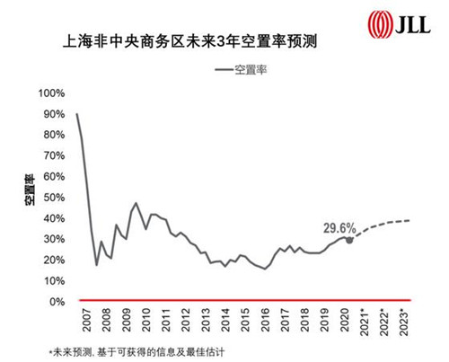 然而,要想真正驅(qū)散疫情所帶來的影響,并非一朝一夕之事。去年全年,上海非中央商務(wù)區(qū)新增供應(yīng)為76.3萬平方米,未來3年內(nèi)預(yù)計(jì)將有400萬平方米辦公面積入市,疫情和新增供應(yīng)令市場不斷承壓,非中央商務(wù)區(qū)2020年全年空置率小幅上升2.2個(gè)百分點(diǎn)達(dá)29.6%,但仲量聯(lián)行預(yù)計(jì),面對(duì)租戶依舊謹(jǐn)慎保守的租賃策略、租金持續(xù)下跌的需方市場,上海非中央商務(wù)區(qū)供需不平衡的問題極有可能在2021年之后被進(jìn)一步放大,或?qū)?dǎo)致空置率繼續(xù)走高,或達(dá)35%-40%左右。