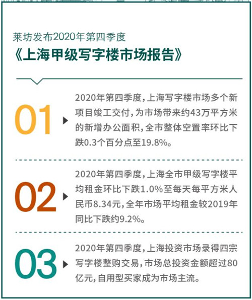 在第四季度新增的寫字樓大宗交易中,中國建設(shè)銀行旗下建信人壽以人民幣55.5億元簽約購入上海綠地外灘中心T4辦公樓,寫字樓及配套建筑面積約為58,800平方米。