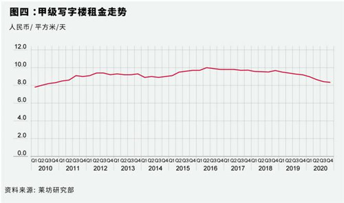 萊坊上海辦公樓服務(wù)部主管李章南表示,核心區(qū)內(nèi)金融機構(gòu)以及專業(yè)服務(wù)企業(yè)租賃活動頻繁給予業(yè)主方較高的市場信心。在給予承租方裝免優(yōu)惠外,業(yè)主降租的意愿不強烈是致使第四季度核心區(qū)租金沒有繼續(xù)大幅下滑的重要原因。如疫情可控,2021年第一季度將有超過50萬平方米的甲級寫字樓項目計劃竣工交付。預(yù)計受新項目交付影響整體空置率將有小幅回升,而由于承租方繼續(xù)嚴控預(yù)算,市場租金將繼續(xù)下行。