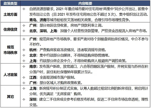 2021年2月,各地方政府繼續(xù)靈活因城施策、多措共舉穩(wěn)樓市。北上廣深杭等多地出臺(tái)樓市調(diào)控政策,內(nèi)容涉及土地出讓、住房信貸收緊、規(guī)范房地產(chǎn)市場(chǎng)秩序等方面。此外,針對(duì)人才落戶、人才購房等方面,部分城市調(diào)控措施較為積極。