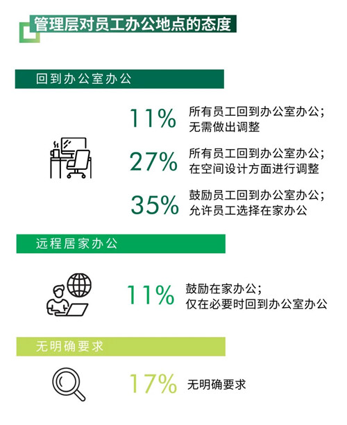 雖然許多企業(yè)仍允許員工繼續(xù)選擇居家辦公,但CBRE調(diào)查結(jié)果顯示,72%的管理層希望或鼓勵(lì)員工回到辦公室工作。