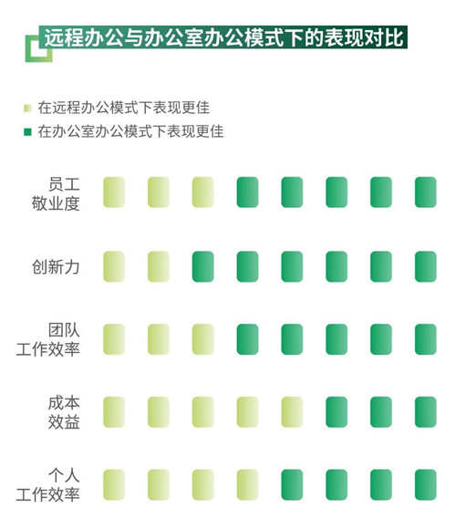 雖然大多數(shù)公司允許員工遠(yuǎn)程辦公,但其并不試圖讓遠(yuǎn)程辦公完全代替辦公室工作。調(diào)查中66%的受訪者表示,希望員工每周遠(yuǎn)程辦公的天數(shù)不超過1-2天?傮w來看,企業(yè)僅能夠接受7%的員工完全的遠(yuǎn)程辦公。因此,實(shí)體辦公場(chǎng)所仍然不可或缺。