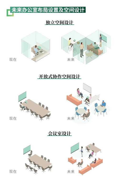 辦公方式的轉(zhuǎn)變也將帶來辦公場(chǎng)所設(shè)計(jì)的變革?臻g設(shè)計(jì)中將更加注重員工體驗(yàn)的優(yōu)化,營(yíng)造有利身心健康、安全舒適的辦公環(huán)境等。辦公空間在傳遞企業(yè)文化、助力提升凝聚力及團(tuán)隊(duì)意識(shí)方面將扮演更為重要的角色。