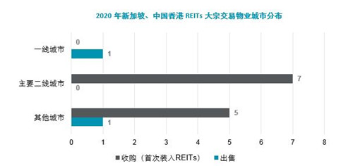 截至2020年12月,新加坡和中國(guó)香港共有16支REITs持有位于中國(guó)內(nèi)地的112處物業(yè),較上一年增加10處。2020年間,新加坡REITs發(fā)生的4筆大宗交易涉及收購(gòu)資產(chǎn)28處,其中首次裝入REITs的資產(chǎn)達(dá)12處;出售物業(yè)2處。首次裝入REITs的物業(yè)均為產(chǎn)業(yè)園區(qū)或物流倉(cāng)儲(chǔ)項(xiàng)目,且收益表現(xiàn)優(yōu)異。在商業(yè)不動(dòng)產(chǎn)市場(chǎng)受到疫情嚴(yán)峻考驗(yàn)的背景下,新加坡REITs選擇裝入這兩類(lèi)資產(chǎn)間接體現(xiàn)了產(chǎn)業(yè)園區(qū)、物流倉(cāng)儲(chǔ)等公共服務(wù)屬性較強(qiáng)的產(chǎn)業(yè)基礎(chǔ)設(shè)施具備更好的抗風(fēng)險(xiǎn)能力。