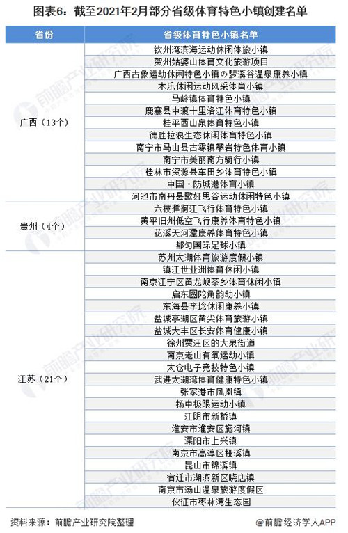 截至2021年2月,江蘇省共公布了三批共21家體育特色小鎮(zhèn)名單,浙江省共公布了三批共19家體育特色小鎮(zhèn)名單,廣西省公布了13家,貴州省公布了4家。