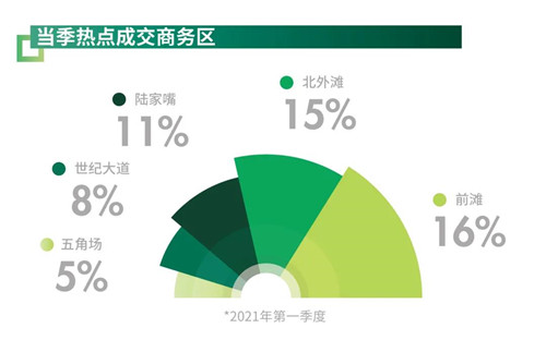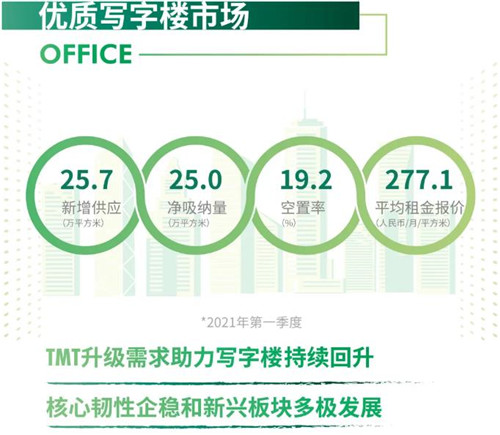 2021年第一季度上海寫字樓市場因去年推遲的部分項(xiàng)目相繼投放市場,新增供應(yīng)較去年同期增長達(dá)342%,其中54%位于徐匯濱江板塊。需求延續(xù)去年底的活躍態(tài)勢,全市單季維持25萬凈吸納量,此供需作用下,空置率環(huán)比下調(diào)0.4%至19.2%。新增供應(yīng)項(xiàng)目年內(nèi)高企,競爭局面促使租金報價仍呈下調(diào)趨勢,環(huán)比微跌0.4%。但伴隨未來供需預(yù)期改善,核心商務(wù)區(qū)內(nèi)小陸家嘴和南京西路的租金可談空間明顯收窄,而其他熱點(diǎn)區(qū)位如前灘、北外灘成熟度攀升,市場呈現(xiàn)核心圈層韌性企穩(wěn)與中環(huán)內(nèi)多極發(fā)展態(tài)勢。