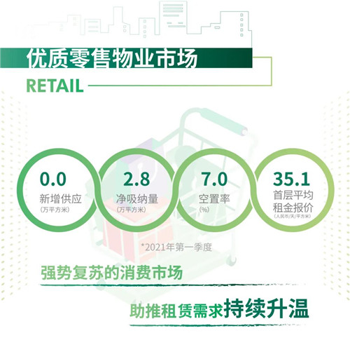 2021年第一季度上海零售市場延續(xù)去年年末的良好態(tài)勢,租賃需求依然活躍,凈吸納量在無新增供應(yīng)入市的情況下錄得28,562平方米,空置率持續(xù)下行0.3個百分點(diǎn)至7.0%,市場預(yù)期向好為租金止跌企穩(wěn)提供支撐,購物中心首層平均租金環(huán)比持平。